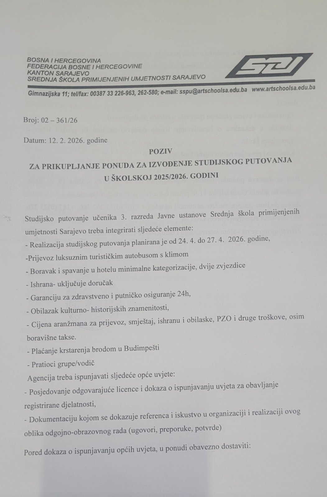 View Larger Image Poziv za prikupljanje ponuda za izvođenje studijskog putovanja u školskoj 2025/2026.godini Poziv za prikupljanje ponuda za izvođenje studijskog putovanja u školskoj 2025/2026.godini Eldina Robovic Suljevic2026-02-12T21:10:05+01:00 12 February, 2026|